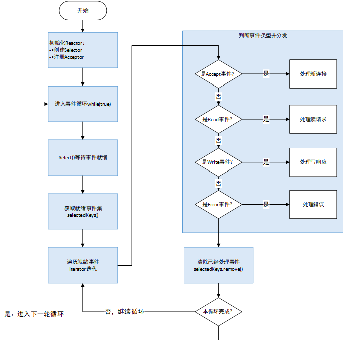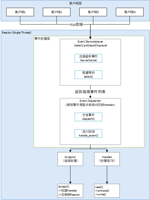- Acceptor:处理连接事件,接受新连接并创建对应的Handler,注册到Reactor(或SubReactor)中。