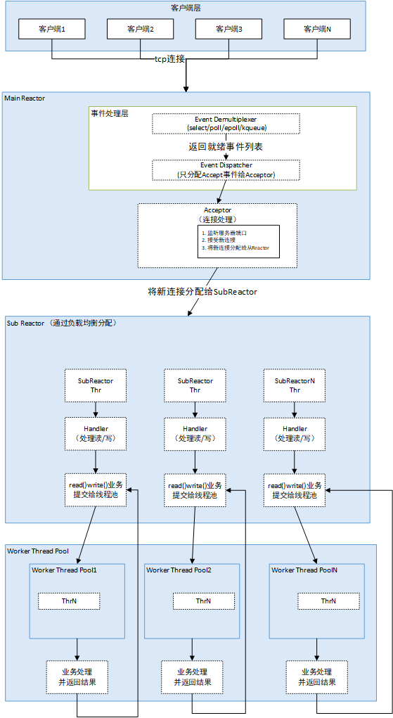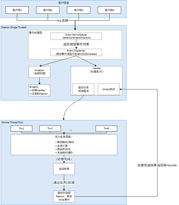 - Worker Thread Pool:工作线程池,处理业务逻辑,避免阻塞Reactor线程。