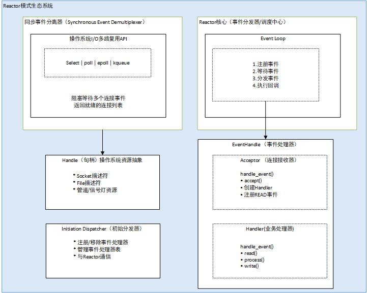 - Event Demultiplexer:同步事件分离器,底层使用I/O多路复用技术(如select、poll、epoll、kqueue)等待事件发生。