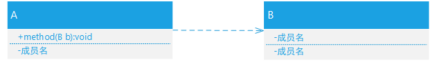 一种使用的关系,即一个类的实现需要另一个类的协助。如方法参数需要传入另一个类的对象,就表示依赖这个类。